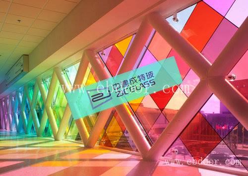 彩色夹胶玻璃由两层或两层以上的玻璃用一层或数层坚韧的聚乙烯醇缩丁醛(彩色PVB/EVA)中间膜,经高温高压(高压窑等设备)加工制成。该产品集安全、采光于一体,清新高雅。产品品种:可根据需要选用普通玻璃、钢化玻璃、镀膜玻璃、防火玻璃等多种原片配合各种颜色的PVB组成外型美观的各种颜色的平、弯夹层玻璃。性能特点:极高的安全性:该产品抗震、耐冲击力强,PVB/EVA粘结力强,当遭受外力而破坏后玻璃碎片不会到处飞溅而伤人;较高的可见度:即使受外力的冲击后破碎,碎片与富有弹性的PVB/EVA结合,仍能保持可见度;PVB颜色丰富,满足现代建筑装饰的需求。适用范围:广泛应用于幕墙、天棚、银行、珠宝店、学校及别墅等对安全性要求较高的场所。汽车挡风玻璃、汽车和船舶等窗户。车站、机场等对隔音有特殊要求的场所。装饰及家具用。防弹玻璃、耐压观察窗等。质量符合:GB15763.3-2009《建筑用安全玻璃 第3部分:夹层玻璃》国家标准。